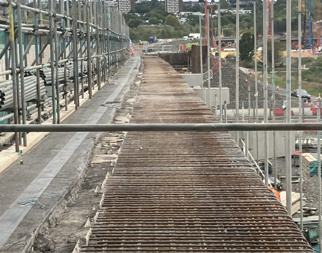 This would expose a 1.9m strip of reinforcing bar onto which Costain could attach new reinforcement for the third carriageway, which would sit on new concrete pillars and steel beams.