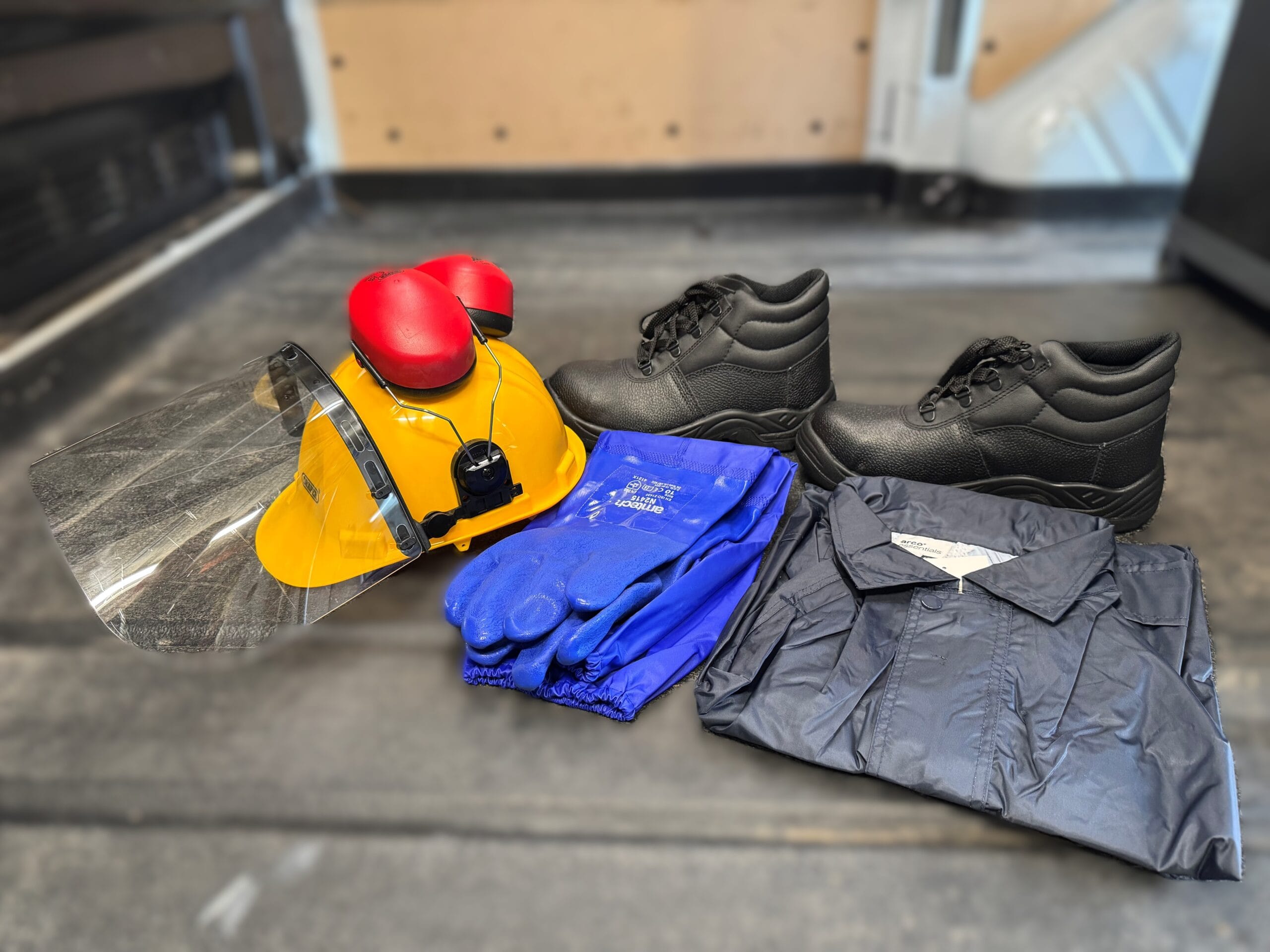 The jetting operator safety kit contains essential PPE items, including waterproof overalls, a safety hat with ear defenders, and a pair of blue gauntlet gloves.